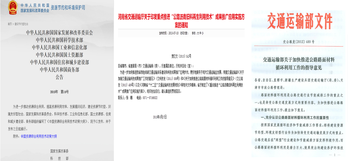 2013年,河南省交通運(yùn)輸廳關(guān)于印發(fā)重點(diǎn)推進(jìn)“公路瀝青舊料再生利用技術(shù)”成果推廣應(yīng)用實(shí)施方案的通知,豫交文【2013】 342號(hào),進(jìn)一步要求重復(fù)利用資源的“可持續(xù)發(fā)展”戰(zhàn)略。