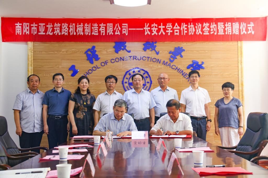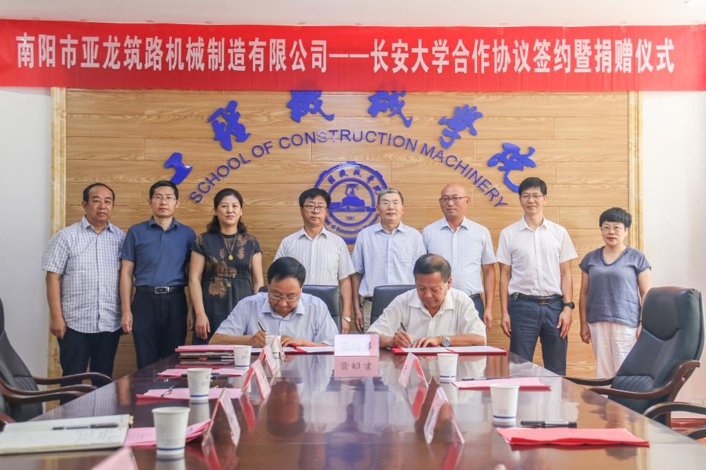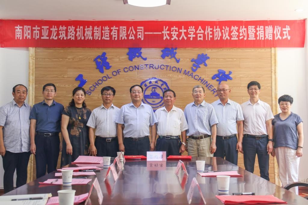 2020年9月3日下午,南陽(yáng)市亞龍筑路機(jī)械制造有限公司——長(zhǎng)安大學(xué)合作協(xié)議簽約暨捐贈(zèng)儀式在工程機(jī)械學(xué)院211會(huì)議室舉行。南陽(yáng)市亞龍筑路機(jī)械制造有限公司董事長(zhǎng)王志興、副總經(jīng)理張大禹、總工程師沈元林,長(zhǎng)安大學(xué)黨委副書(shū)記徐引正,長(zhǎng)安大學(xué)教育基金會(huì)理事長(zhǎng)、社會(huì)合作處處長(zhǎng)鄧云潮,工程機(jī)械學(xué)院黨委書(shū)記于麗娟、院長(zhǎng)胡永彪出席簽約儀式。會(huì)議由胡永彪主持。