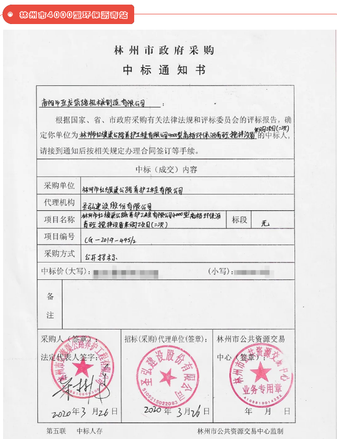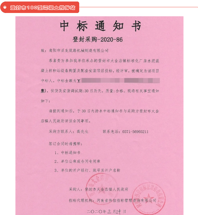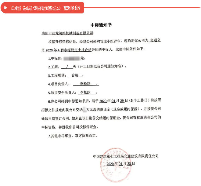 3月26日中標“林州市紅旗渠公路養(yǎng)護工程有限公司4000型高檔環(huán)保瀝青砼攪拌設備采購項目”,3月30日中標“登封市大金店鎮(zhèn)標準化廠房水泥混凝土拌合站設備購置及配套安裝項目”,4月23日中標“中建七局交通公司2020年4套水泥穩(wěn)定土拌合站采購項目”。